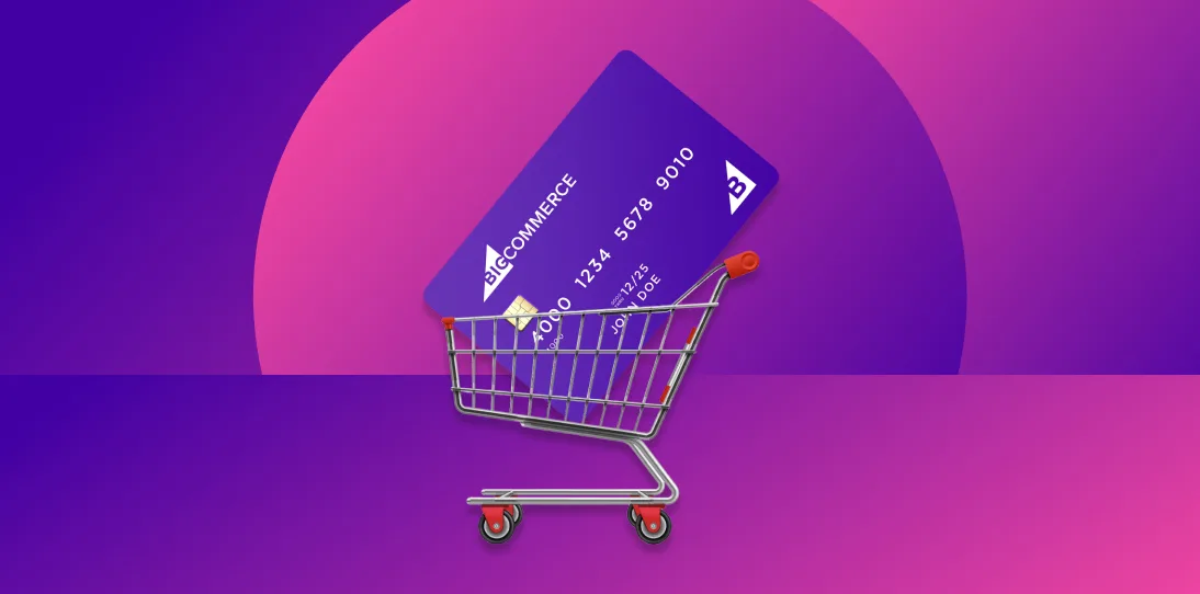 Hand with credit card and a small shopping cart coming from laptop screen isolated in white